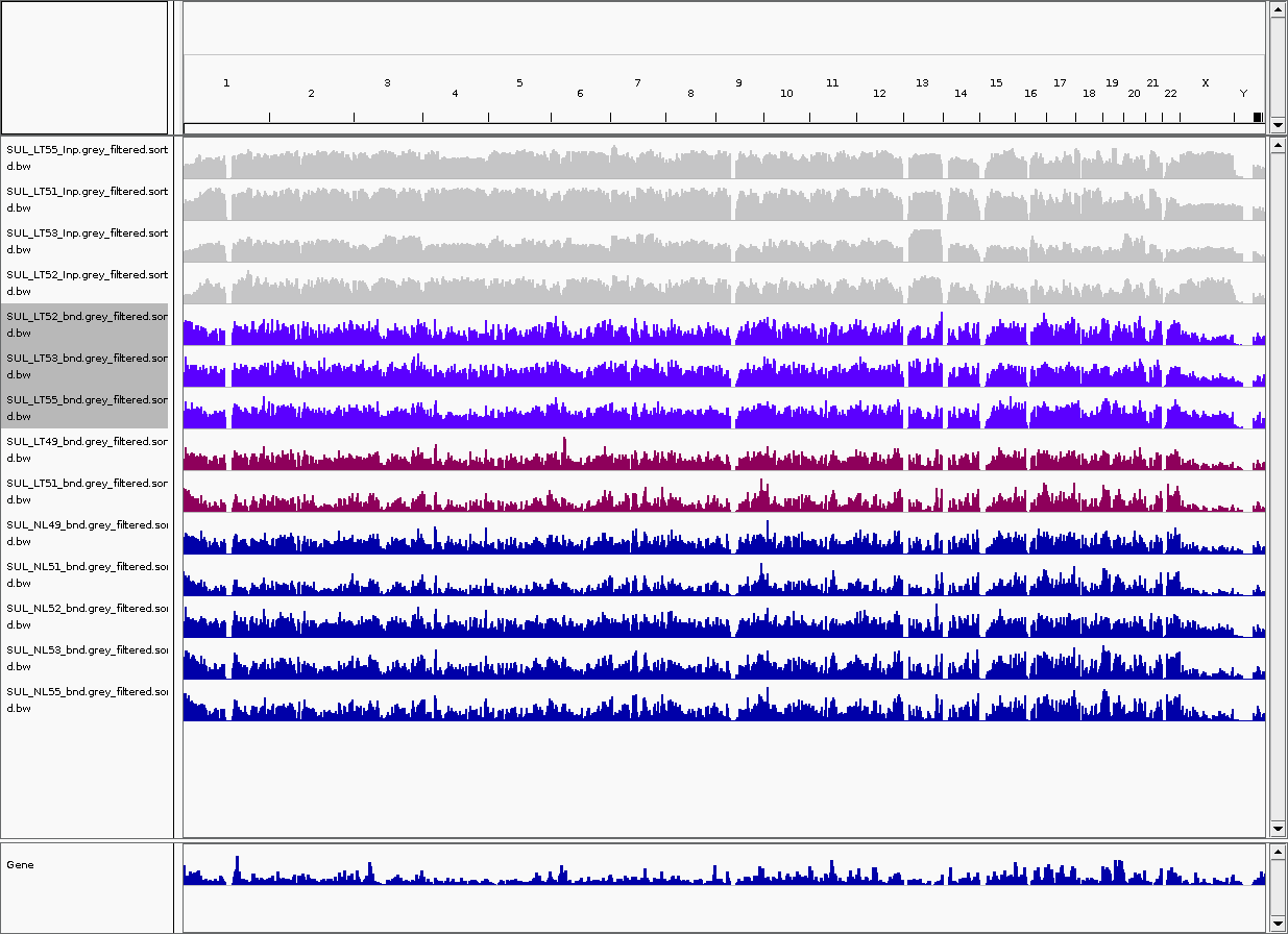 After removing, I used IGV to check the bam file across human genome. Below are part of the samples. On the top is a grey Inpu sample, they are generally fine, but they have some gaps across whole genome.